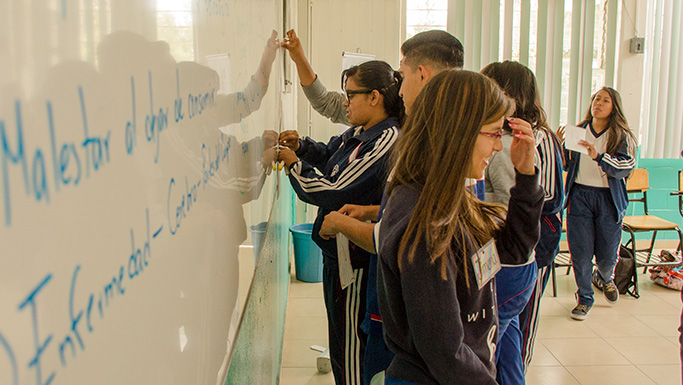 Prevención de adicciones en la comunidad escolar desde un enfoque psicosocial, a través de la formación de docentes y promotores juveniles, quienes replican el programa con estudiantes y compañeros de escuela